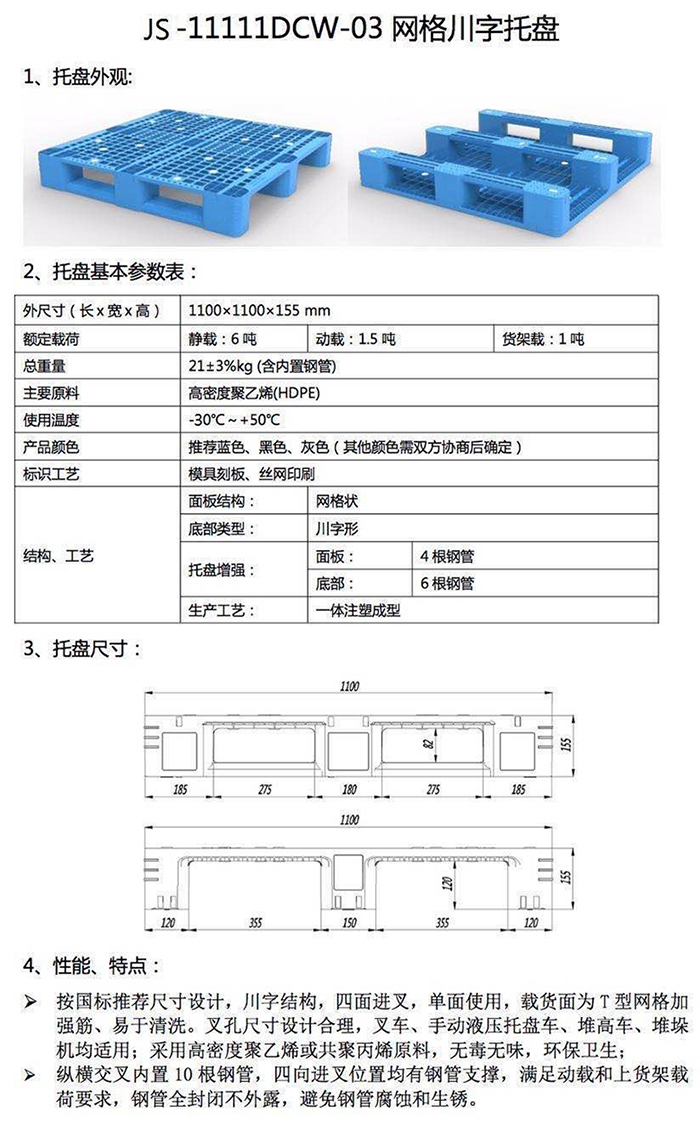 2、塑料托盤產(chǎn)品尺寸誤差正負2%,重量誤差正負3%,均屬于企業(yè)標準允許的范圍。