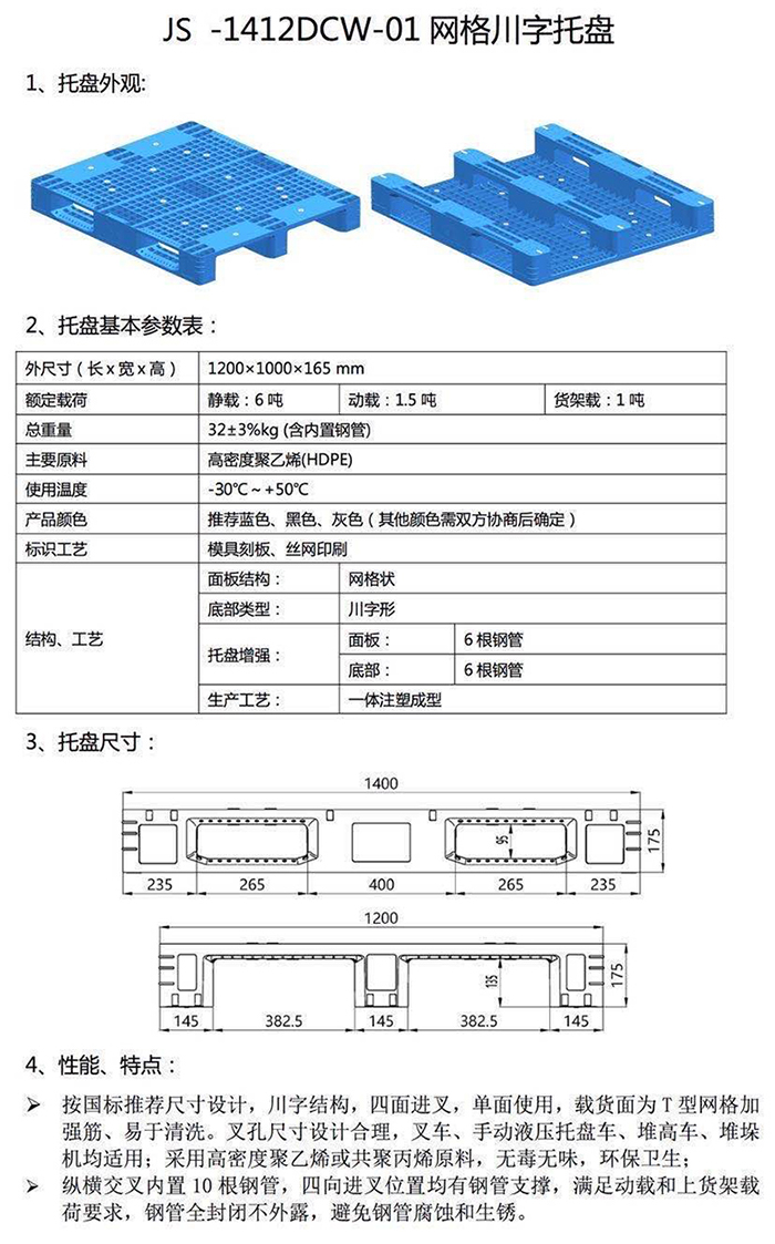 3、塑料托盤的適應(yīng)環(huán)境溫度:-25℃-80℃(盡量避免陽(yáng)光爆曬及靠近熱源)。